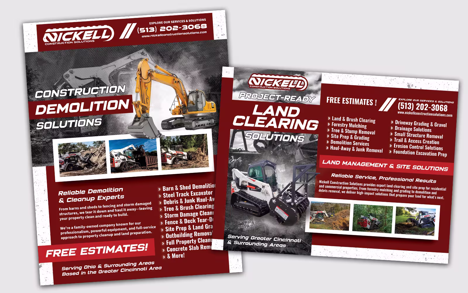 Nickell Construction Solutions specializes in earthmoving, landscaping, demolition, and land development. Foreman Creative delivered a comprehensive branding and web development package to establish a professional identity, enhance credibility, and boost market visibility.